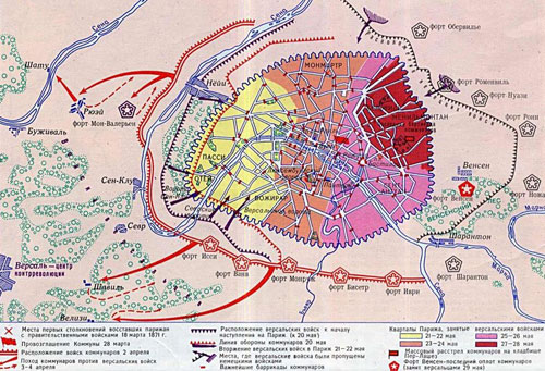 Пока в Париже митинговали и спорили по мелочам, вроде сроков ремонта водопровода и размеров пайков для гвардейцев, Тьер договорился с банкирами о большом займе, а с немцами, не желавшими победы Коммуны, об отпуске военнопленных. Вскоре баланс сил, изначально благоприятный для восставшего Парижа, изменился, и 21 мая версальцы перешли в наступление.