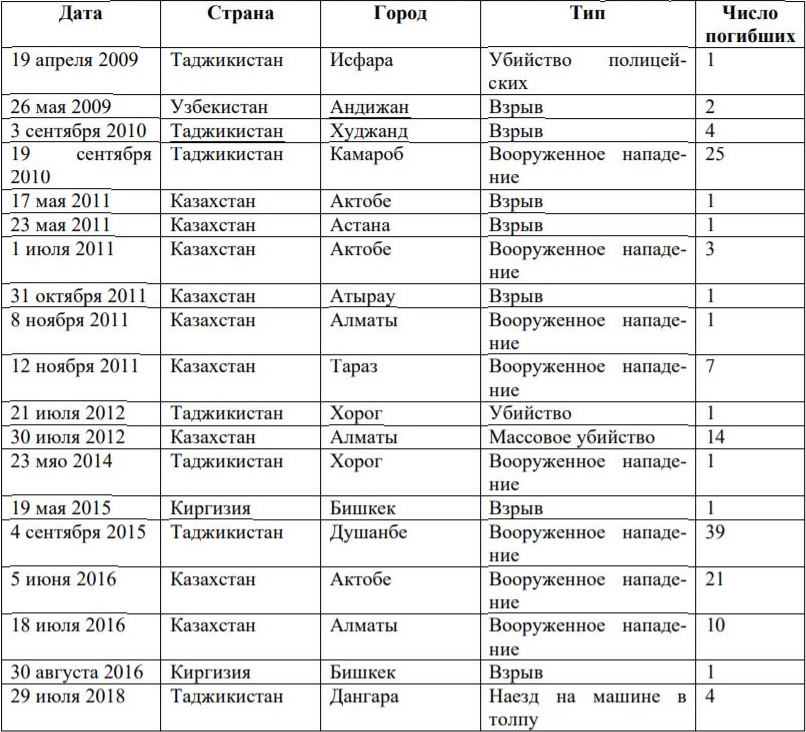 Таблица 1. Террористические атаки в Центральной Азии (2009-2018 гг.).