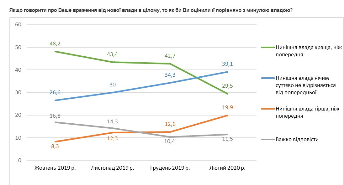 Рис.2 Изменение отношения граждан Украины к нынешней и предыдущей власти с октября 2019 по февраль 2020 гг.